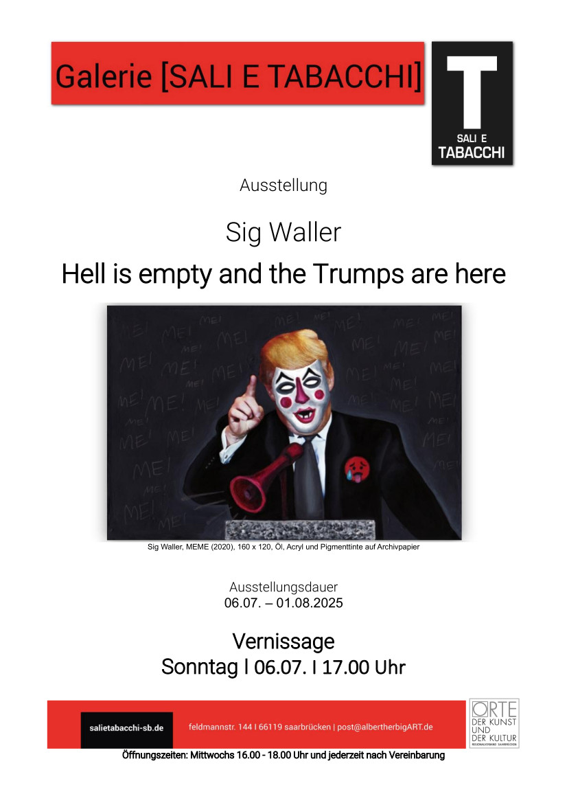 Seit sechs Monaten ist der „Dealmaker“ zurück im Weißen Haus! Mit seinem königlichen Auftreten samt Hofschar und vergoldeten, an römische und französische Kaiser und Könige erinnernden Requisiten inszeniert er sich mit seinem düsteren Blick und seinem beleibten, „mächtigen“ Körper als Zentrum der Macht. Vor diesem Hintergrund zeigt die Galerie [SALI E TABACCHI] in Anspielung auf das berühmte Shakespeare Zitat die Ausstellung „Hell is empty and the Trumps are here“ – eindrückliche Arbeiten der aus Swansea stammenden deutsch-amerikanisch-britischen Künstlerin Sig Waller.